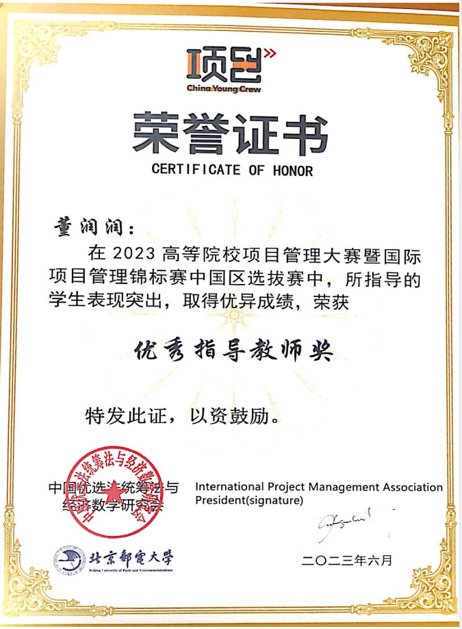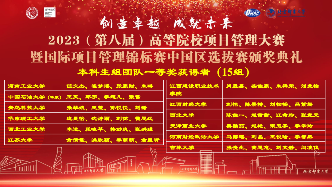 2023年6月3日,由中国优选法统筹法与经济数学研究会和国际项目管理协会(IPMA)联合主办,北京邮电大学承办,上海普华科技发展股份有限公司、西安华鼎项目管理咨询有限责任公司协办的“2023年(第八届)高等院校项目管理大赛暨国际项目管理锦标赛中国区选拔赛颁奖典礼”在北京邮电大学举行。我校亚洲av 工程管理专业组成的参赛队伍成功进入全国总决赛,经过层层角逐,最终取得本科生组团队一等奖第一名。