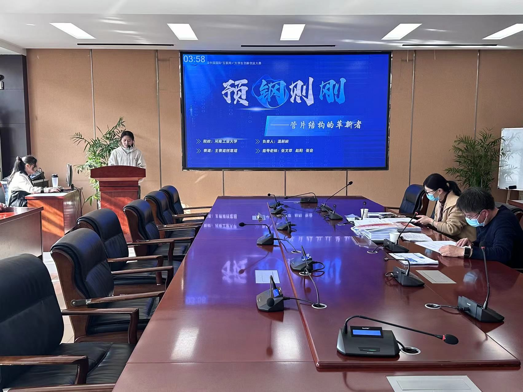 会上,13支团队按照抽签顺序依次进行项目展示。团队队员分别从市场痛点、项目简介、技术创新、社会效益、营销策略、未来展望等方面进行了项目汇报。评委老师在认真听取每个项目汇报后,对作品进行了点评,指出了存在的问题,并给出修改意见和建议。