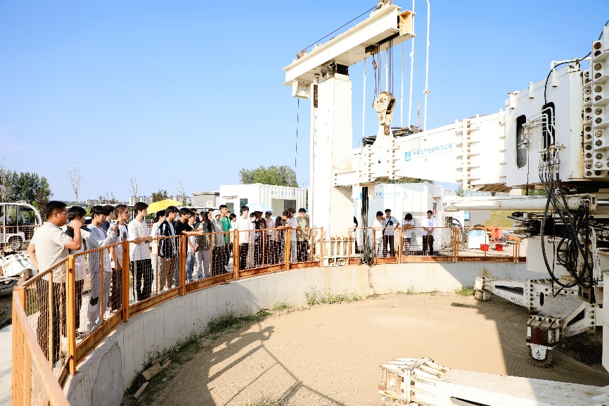 在专业老师的带领下,同学们深入地下仓储试验场、路基与道面试验场,了解道路建设、运维、管理知识。中建地下空间智能装备中心主任胡怀仁围绕SECM城市大直径竖井掘进装备的施工原理、适用场景等与同学们交流讨论,并现场演示SECM城市大直径竖井掘进过程,将理论知识与现场实践相结合,加深了同学们对竖井掘进技术的认识。